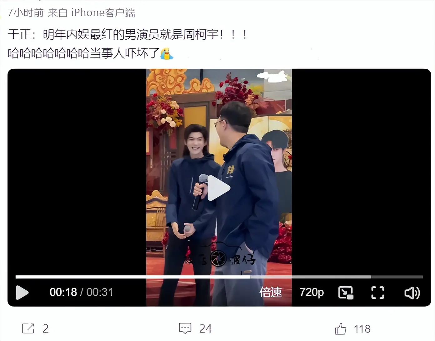 《金吾不禁》开机的时候,于正和周柯宇与来到现场的粉丝对话,于正希望大家可以多宣传《金吾不禁》,万万没想到的是,下一秒,于正竟说:明年内娱最红的男演员就是周柯宇。